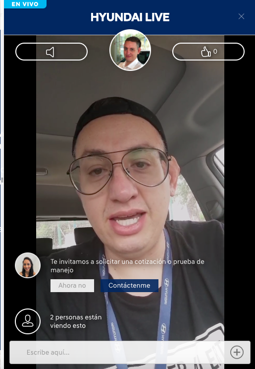 La segunda es una experiencia personalizada, en la que un usuario puede solicitar hablar en directo con un representante de Hyundai y resolver dudas sobre algún modelo en específico, de igual forma se pueden mostrar detalles de un automóvil y hacer las pruebas que se le soliciten. Bajo esta modalidad se pueden pedir cotizaciones, hacer citas para pruebas de manejo y canalizar con un distribuidor autorizado para el seguimiento puntual de la compra.